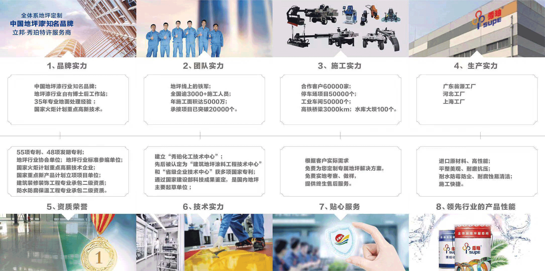 我公司為立邦.秀珀地坪的特許服務商,并與西卡·巴斯夫品牌有著緊密合作關系,施工流程標準化、精細化,工程質量有保障。立邦.秀珀化工涂料有限公司,創建于1984年,是國內較早引進地坪漆生產技術的企業,總部位于廣州番禺,在廣東翁源、上海浦東、河北廊坊擁有三大生產基地,下設5個全資子公司。年產值逾7億元人民幣,是國內地坪行業擁有博士后工作站的企業,獲得多項國家專利,并通過國家建設部科技成果鑒定,是國內地坪標準主要起草單位。為國內地坪行業知名品牌!